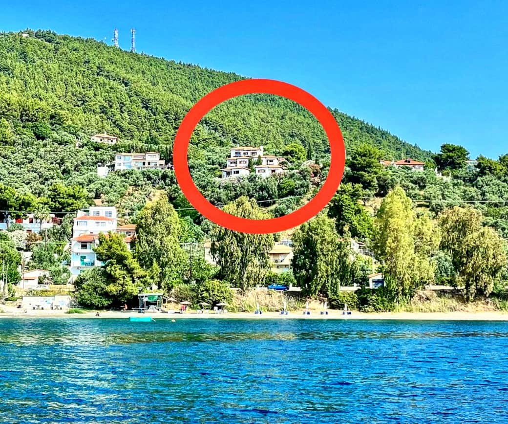 From Skiathos Town or Skiathos Airport or the Skiathos Port - take the ring road out of town towards Koukounaries. Pass the new circle just outside town. Look for bus stop 5 and take Ftelia Road up towards the mountain (between the supermarket and Villa Ella). We are the 5th property on the left towards the sea.